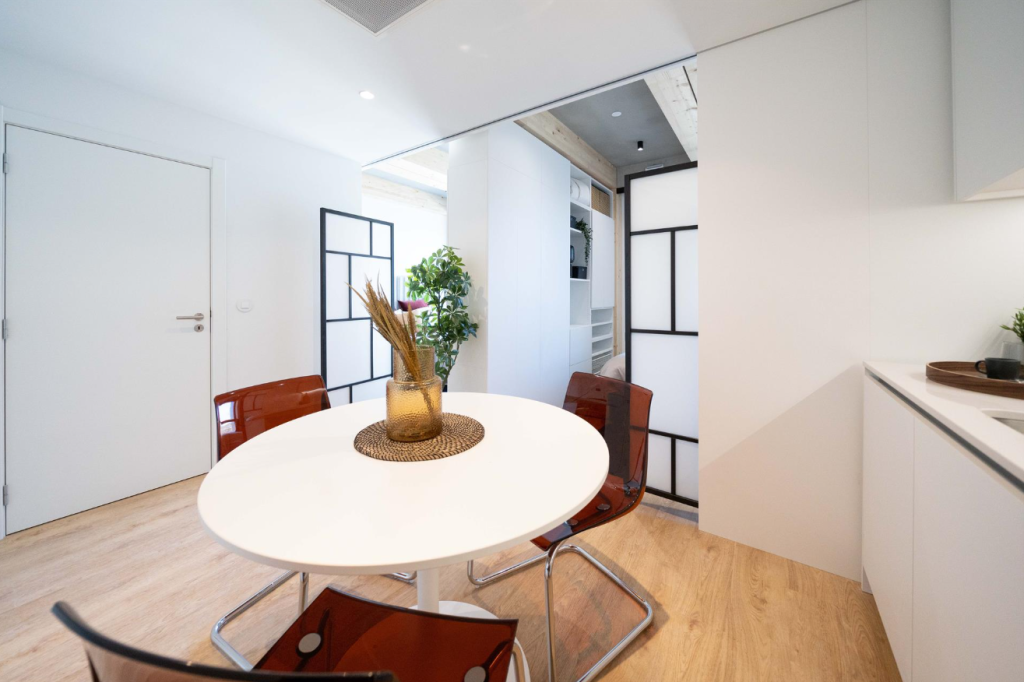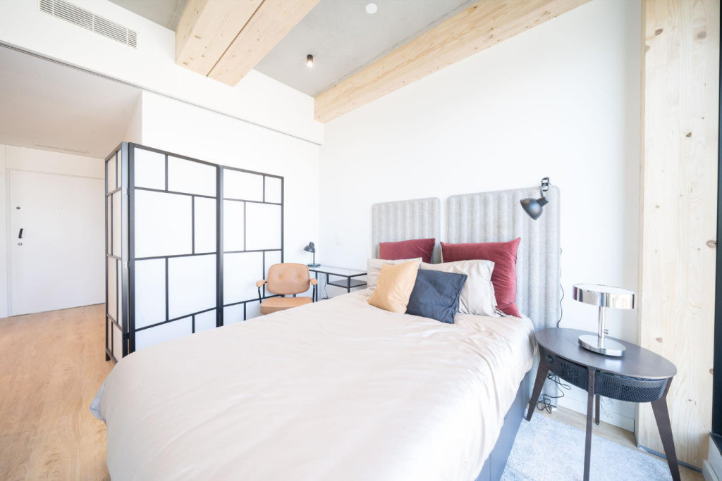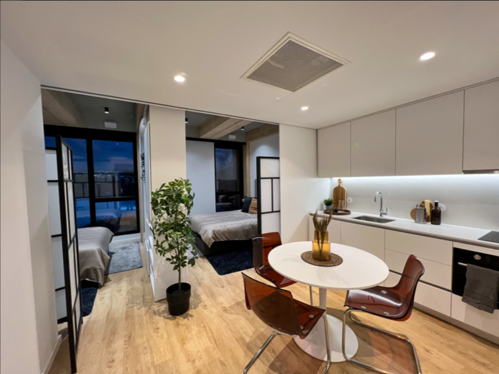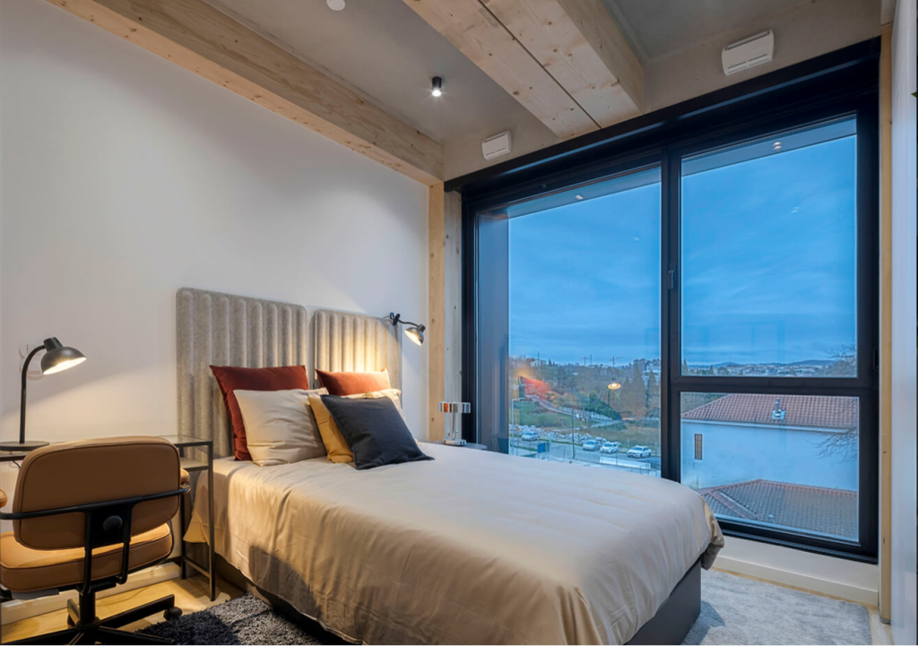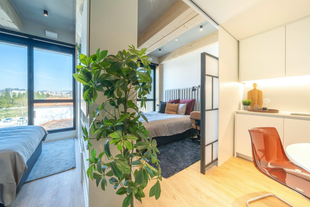 Foi desenhado para a máxima funcionalidade, graças a um design de mobiliário inteligente, o espaço adapta-se às suas necessidades, permitindo configurar 1 ou 2 quartos. A climatização por conduta e sensor Atmocube para monitorização contínua da qualidade do ar, piso vinílico me carvalho e acabamentos contemporâneos com loiças suspensa e com pré-aquecimento de águas por painéis solares.